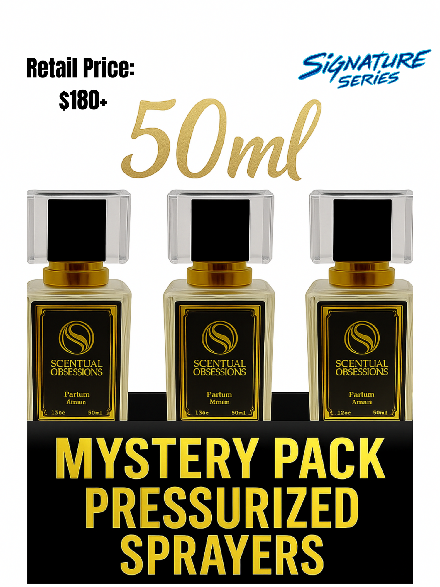 Three full-size 50ML Signature Series fragrances, randomly selected from our current catalog. These are high-quality extrait blends with incredible performance — the only mystery is which ones you’ll get. Ideal for collectors, risk-takers, or fans who want more of what Scentual Obsessions is known for: bold, long-lasting scents made in-house.