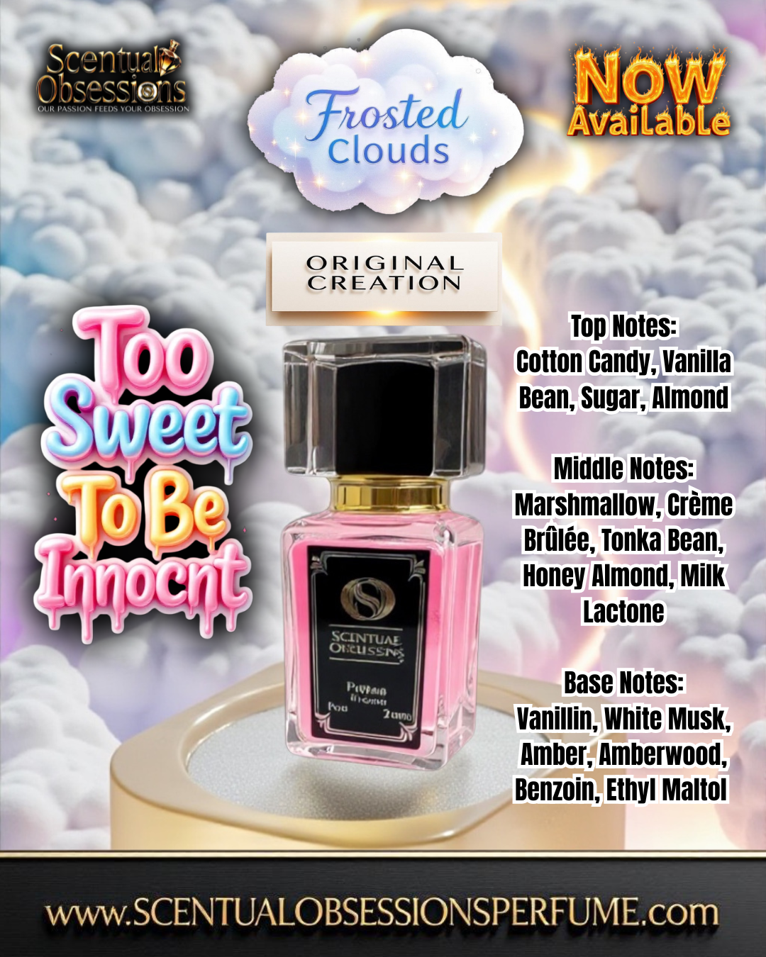 Base: Vanillin, White Musk, Amber, Amberwood, Benzoin, Ethyl Maltol